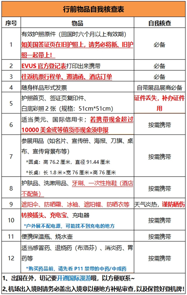 特別提醒:一定要隨身攜帶含有有效美國簽證的護照原件(護照有效期須在回國日期后至少有六個月有效期,美國簽證如在舊護照上,舊護照原件也必須攜帶)、EVUS登記成功打印頁面(沒有登記將無法出境)、展會邀請函、機票行程單、酒店訂單入境美國。