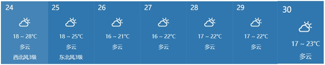 在臺期間:平最高氣溫28℃,最低氣溫16℃。溫度適宜。