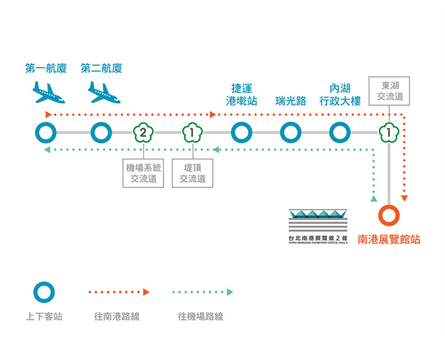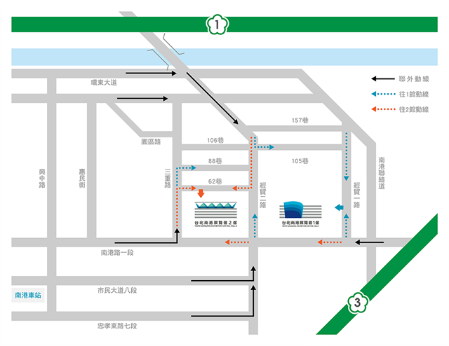 ? 搭乘捷運「文湖線」于「南港展覽館站」下車,并于1號出口離站沿左側至南港1館; 沿右側「南港2館地下連通道」至南港2館。