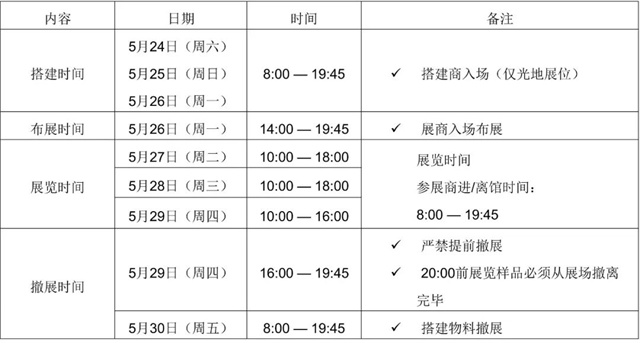 1. 請到達(dá)展位后,核對展具配置:具體配置以貴司填寫提交的搭建信息表格為準(zhǔn),如有問題或請務(wù)必于布展當(dāng)天(5月26 日)16:00 前,前往中國展區(qū)服務(wù)臺報(bào)修,過期視為符合要求不做更改。因現(xiàn)場搭建工作量較大,且主場工人效率不高,如有展具缺失等情況,報(bào)修后請耐心等待,會逐步安排。