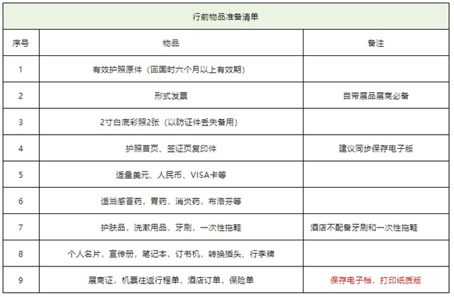 2、展商如需手提展會樣品及印刷品入境,請提前準備 Packing List 和 Invoice,及產品的相關證明/認證,標注好樣品,以便海關查驗。