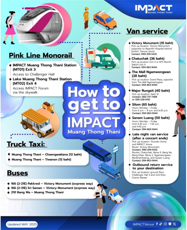 *新粉線:•在Si Rat車站(PK09)轉乘Impact Spur線,在Impact Muang Thong Thani站(MT01)下車。從Impact Muang Thong Thani站3號出口出站后,前往Challenger大廈或Impact Arena,步行至Impact Exhibition Centre。