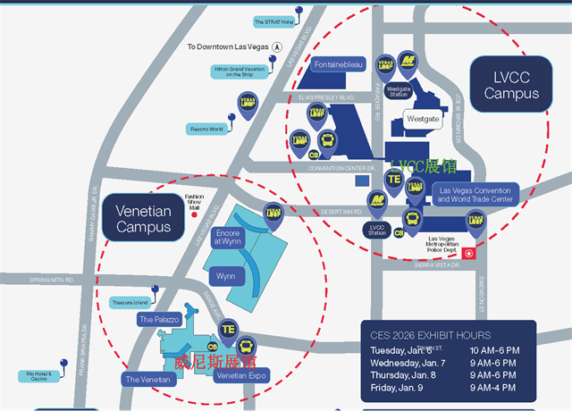 1月5日(周一)至1月9日(周五),部分官方CES酒店提供往返拉斯維加斯會議中心(LVCC)和威尼斯人會展中心(VenetianExpo)的免費班車服務(wù)。班車時刻表及參與的酒店,詳見附件。