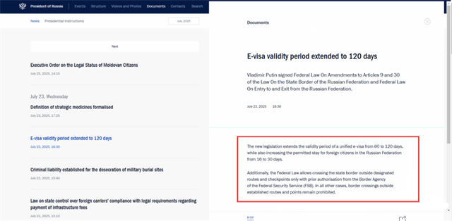 新立法將統(tǒng)一電子簽證的有效期從60天延長到120天,同時(shí)將外國公民在俄羅斯聯(lián)邦的允許逗留時(shí)間從16天增加到30天。